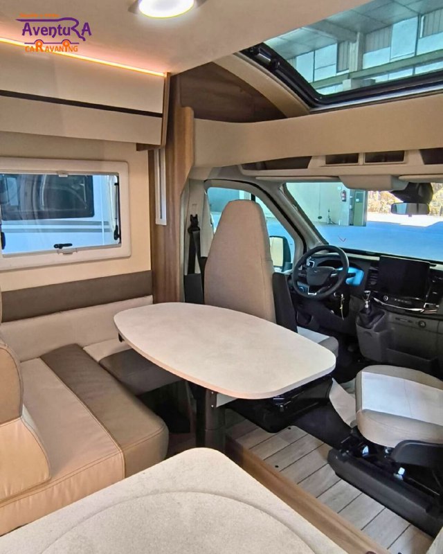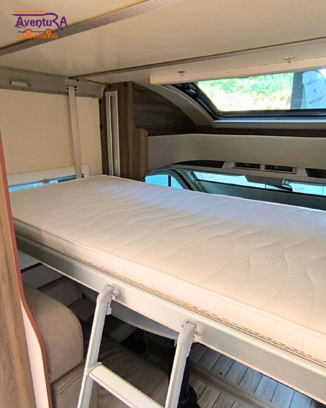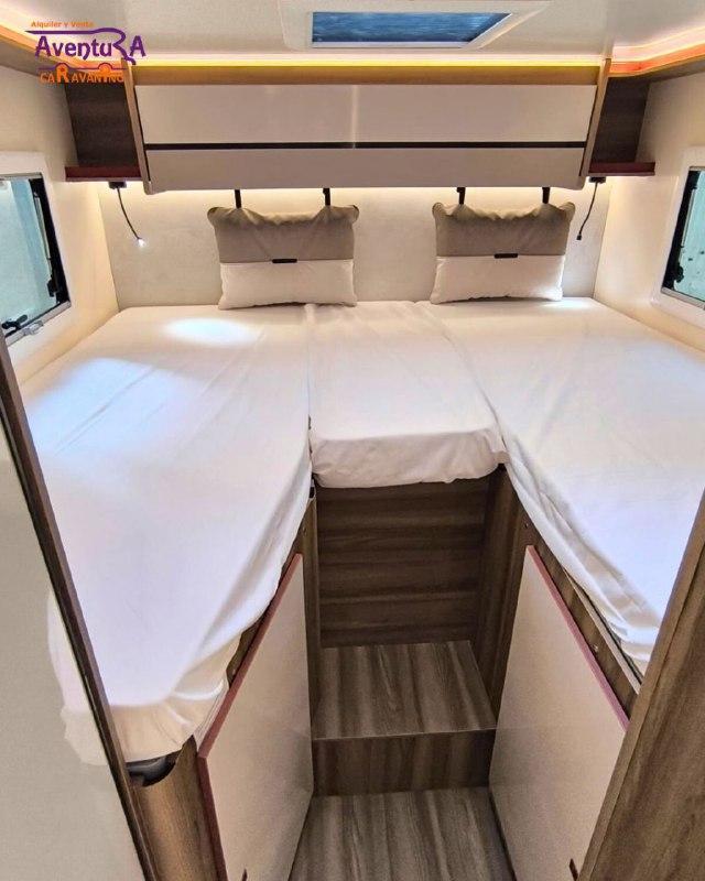 Autocaravana perfilada compacta de 6,69m de longitud y 2,15m de ancho. Camas gemelas, cama basculante individual y salón convertible en cama.